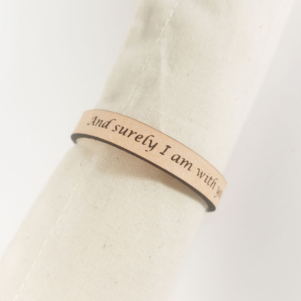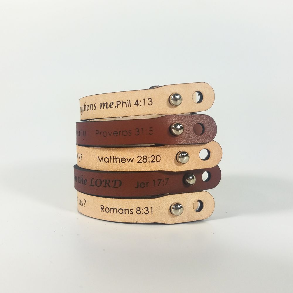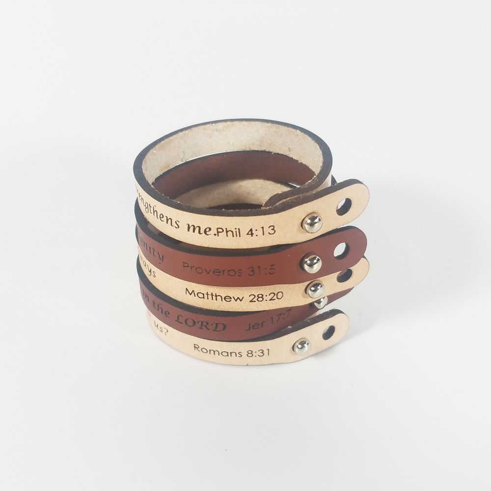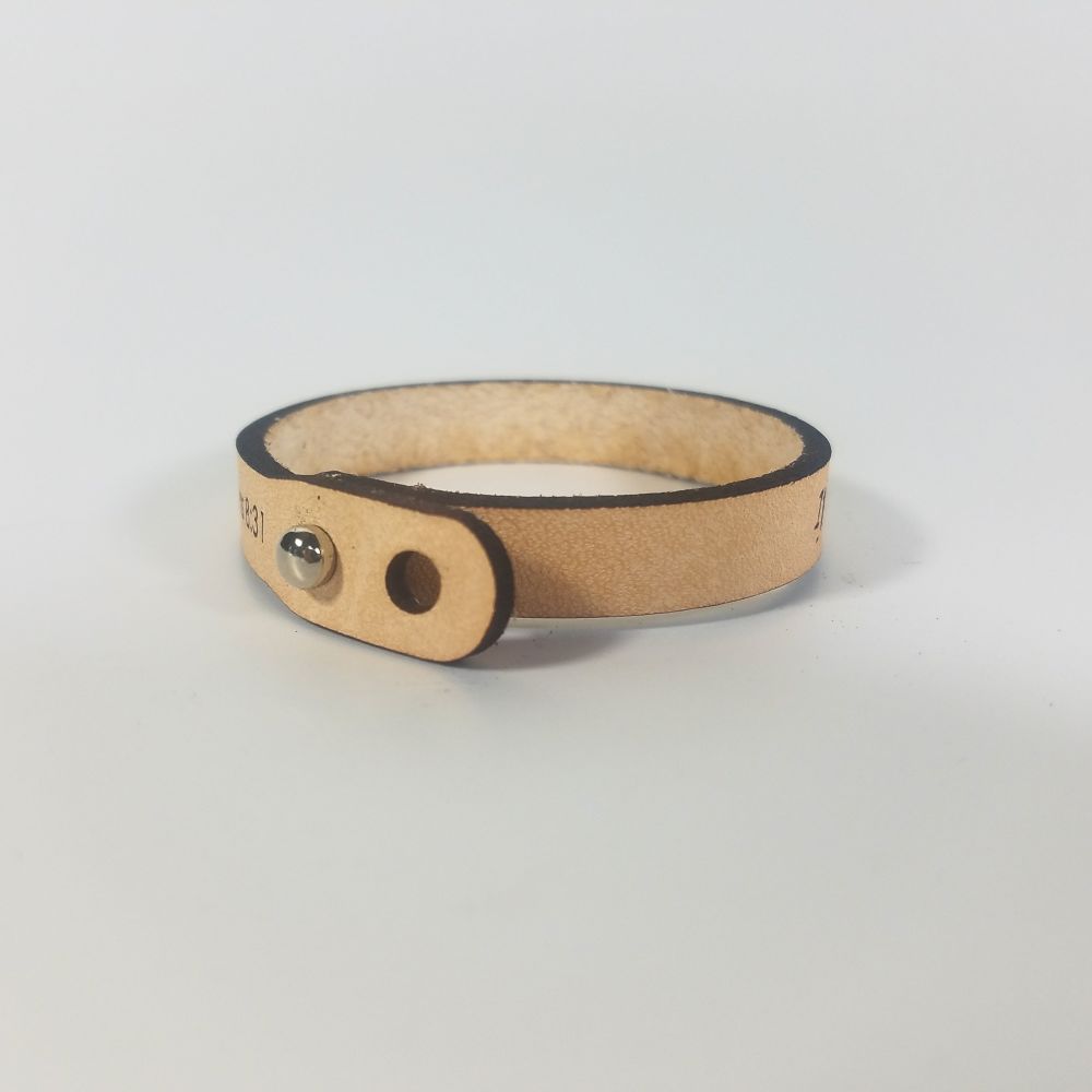 Bracelets are 3/8" wide and are available in natural or amber leather.